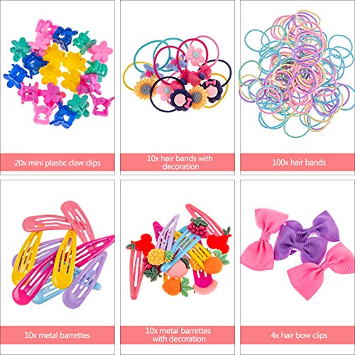 Articles multicolores et divers: 4 différents types d’accessoires pour cheveux mous pour les filles dans un seul paquet — 110 bandes de cheveux & 20 mini pinces à griffes en plastique & 20 pinces à cheveux à pression & 4 Épingle à cheveux arc. Ces accessoires pour cheveux multicolores peuvent vous aider à créer des looks de mode différents.