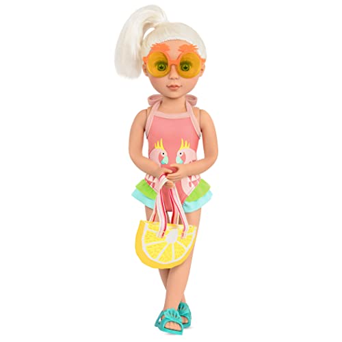 “Tropical style that’s sweeter than fruit punch are easy when you dress your dolls in the Ray of Light outfit from Glitter Girls! Spread your colorful wings and get ready for sunshine, giggles, and sparkling beach adventures in this adorable and stylish swimsuit that’s perfect for lounging in sunbeams and dreaming of summer! This 14-inch doll clothing set includes a swimsuit with a pretty parrot print and cute ruffle details, a lemon tote bag to carry accessories, glitter seashell sandals, and super-cool pineapple sunglasses for an extra touch of dazzle. All the parts of this outfit can easily be mixed and matched with other Glitter Girls outfits and accessories! (Dolls sold separately) Glitter Girls clothes and accessories are compatible with most 14-inch dolls. Recommended for kids ages 3+ (small parts).”